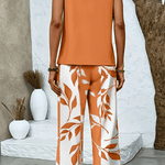Adelaide | Conjunto Padrão Folhas Laranja é um conjunto sofisticado, onde a consideração pelo artesanato encontra materiais de alta qualidade numa nuance quente de laranja queimado. A silhueta leve e o par de calças com estampa de folhas criam uma atmosfera tropical e intemporal, perfeita como roupa de férias ou de fim de semana, além de ser um toque refinado para o dia a dia. O top em camadas realça todas as formas corporais e proporciona liberdade de movimento respirável, enquanto as calças largas contribuem com uma elegância descontraída e sofisticada. Ligado à origem e cuidadosamente selecionado na sua construção, o conjunto é uma verdadeira peça de colecionador — um investimento em durabilidade, conforto e estilo, que mantém o seu apelo ao longo das estações. Isto é mais do que uma dupla de guarda-roupa; é uma solução intemporal para aqueles que valorizam qualidade e tranquilidade no dia a dia.